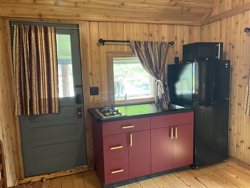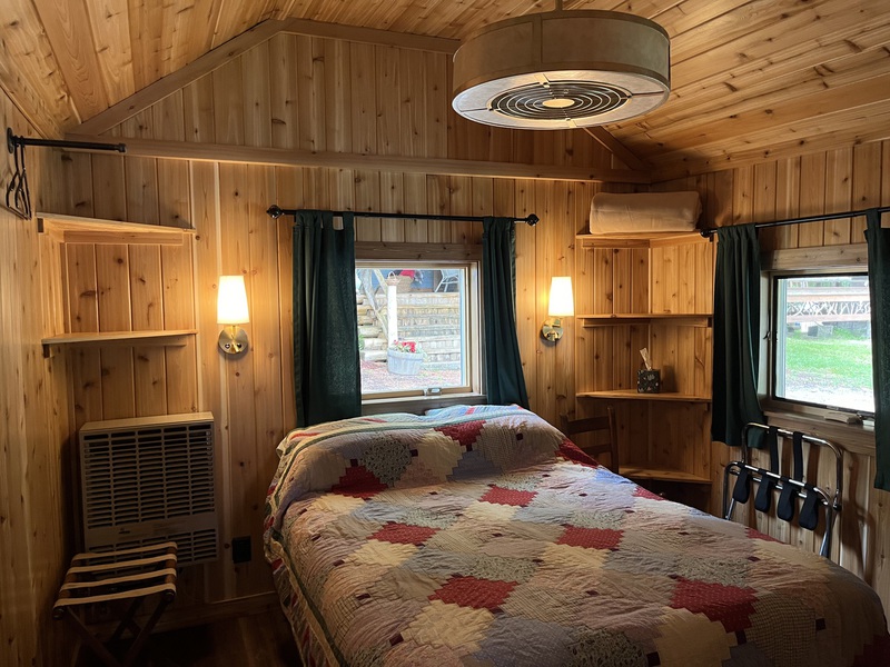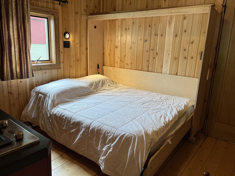 The Fox Den sits across the street from the public beach and is near the Arts Center, boat livery and tennis courts. It was built by the CCC as part of Roosevelt’s New Deal in the 1930s. Breakfast may also be available at the Blue Mountain Lake Inn’s kitchen when the house is not fully rented. The cabin consists of a multipurpose room, including a kitchenette and short queen murphy bed, a bedroom with a queen bed, a bathroom and a furnished porch.